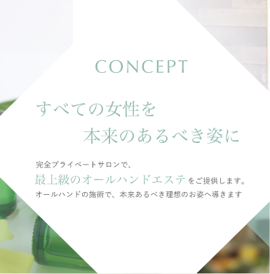 カウンセリングから着替え、施術、お客様一人一人のプライベート個室にて対応させていただきます。また、担当が途中で変わることがございませんので、ごゆっくりと安心しておくつろぎいただけます。